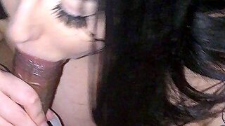 Dark haired amateur blowjob and handjob in fake taxi