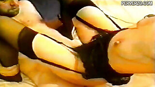 Brunette babe plays with big tits and pussy in retro nylons and lingerie