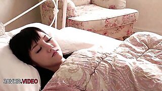 Sexy as hell brunette likes touching her shaved pussy in the bedroom