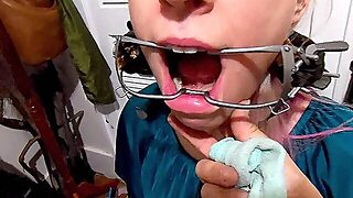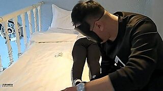 Petite brunette teen in gimp outfit and socks passionately sensually humps and gets a facial jizz flow