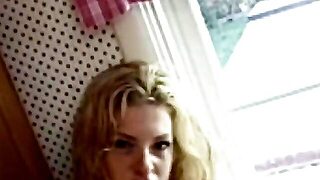Curly retro girl sits on the floor and passionately masturbates pussy