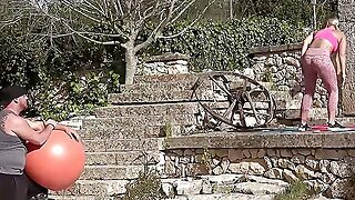 Outdoor the horny blonde Slut gets fucked after her Yoga Session, a horny Threesome cant be...